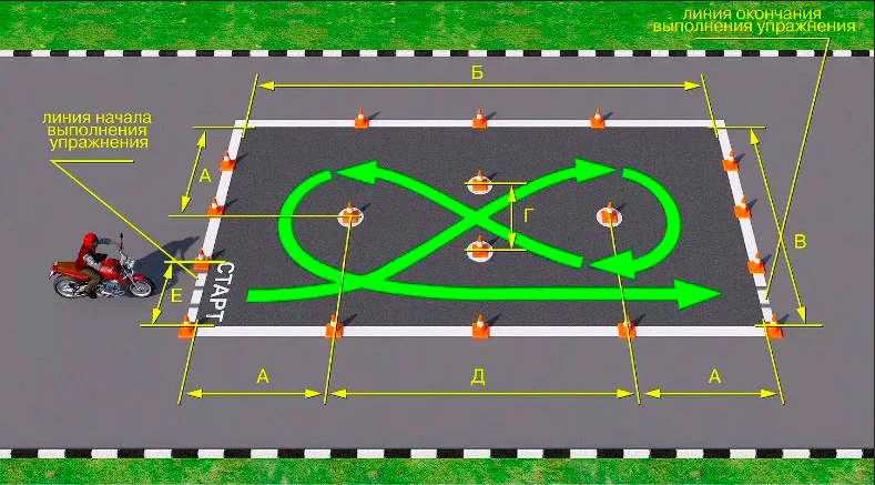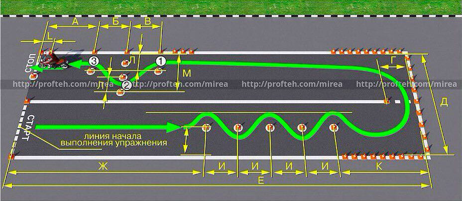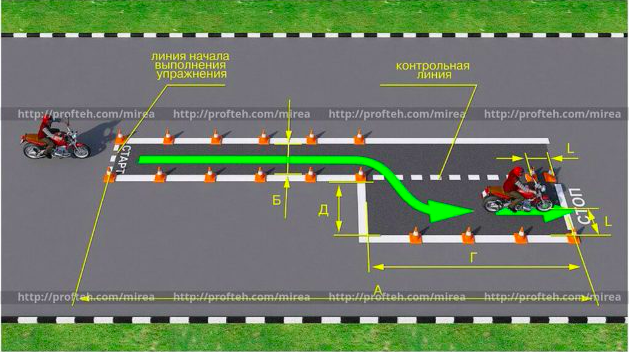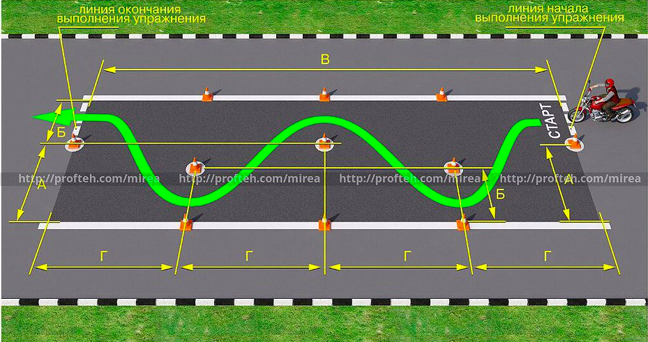 Кандидат в водители осуществляет движение по заданной траектории, оставляя первый разметочный конус с левой стороны от мото транспортного средства, последовательно объезжая разметочные конуса с левой и правой сторон.