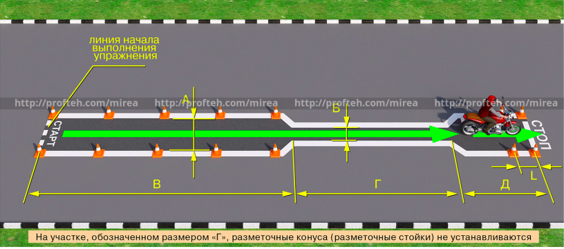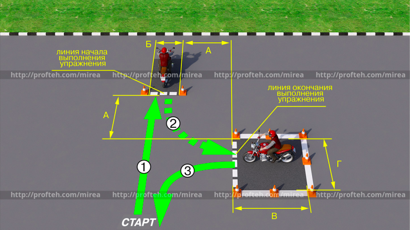 Кандидат в водители после пересечения на мото транспортном средстве линии начала выполнения упражнения останавливается в обозначенном месте так, чтобы мото транспортное средство по проекции заднего габарита пересекло линию начала выполнения упражнения, выключает двигатель и спешивается.