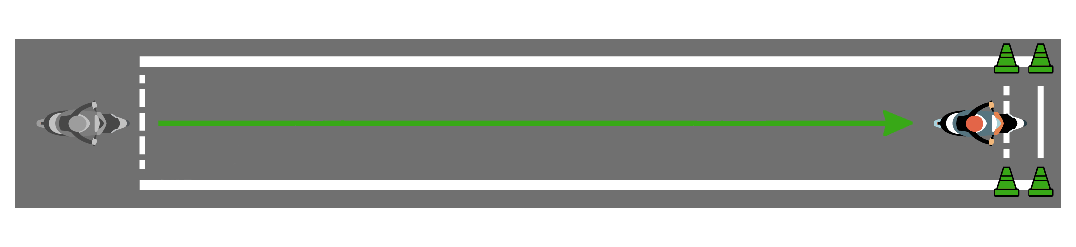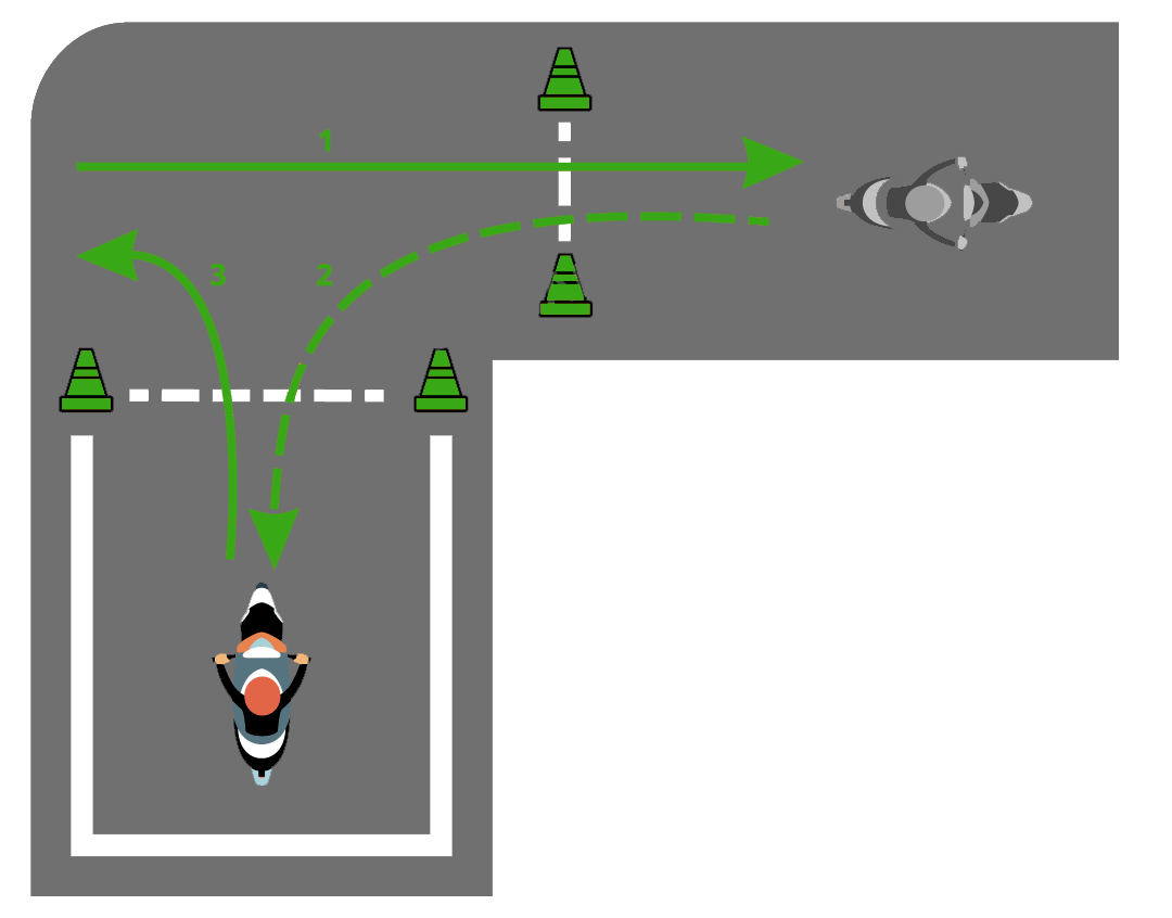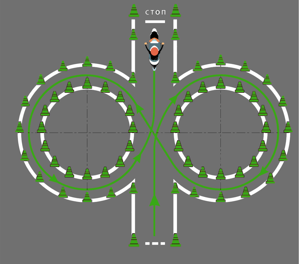 - Пересечь линию начала выполнения упражнения и остановиться в обозначенном месте так, чтобы ТС по проекции заднего габарита пересекло линию начала выполнения упражнения, выключить двигатель и спешиться