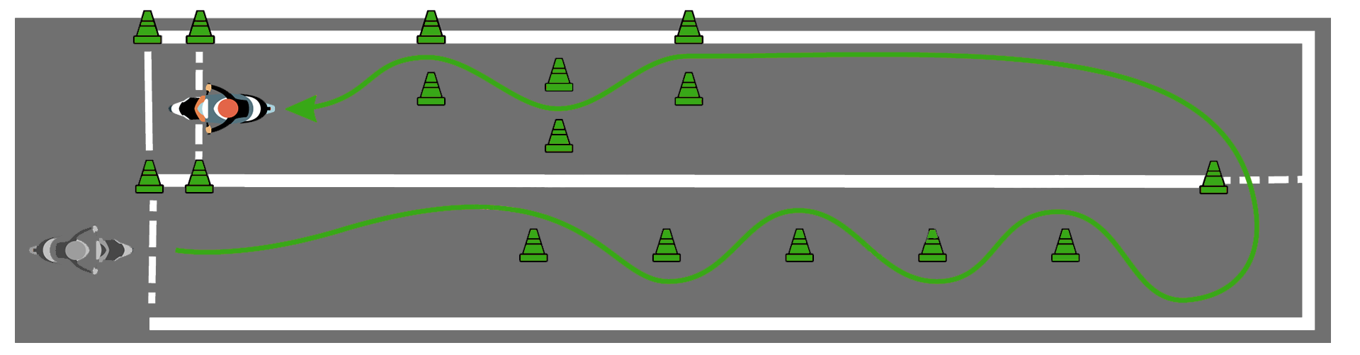 Осуществить движение по заданной траектории, оставляя первый разметочный конус с левой стороны от мото транспортного средства, последовательно объезжая разметочные конуса с левой и правой сторон